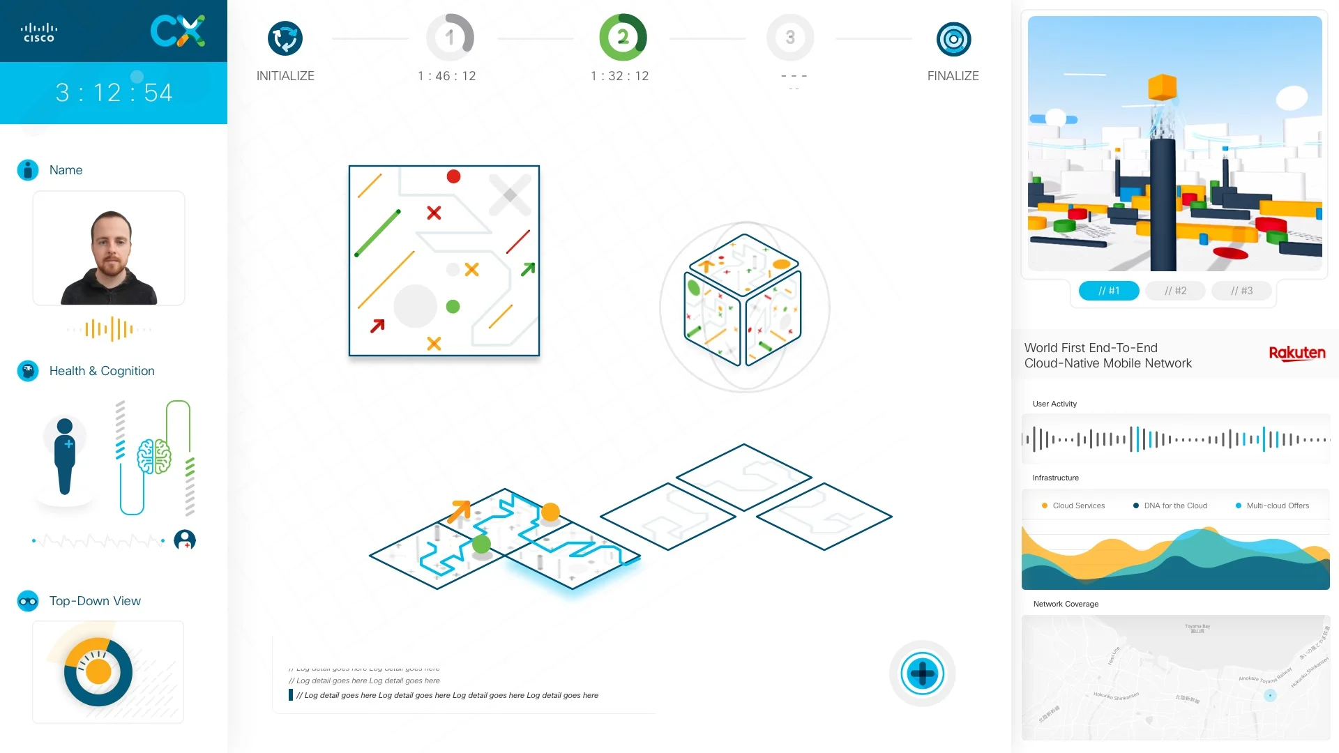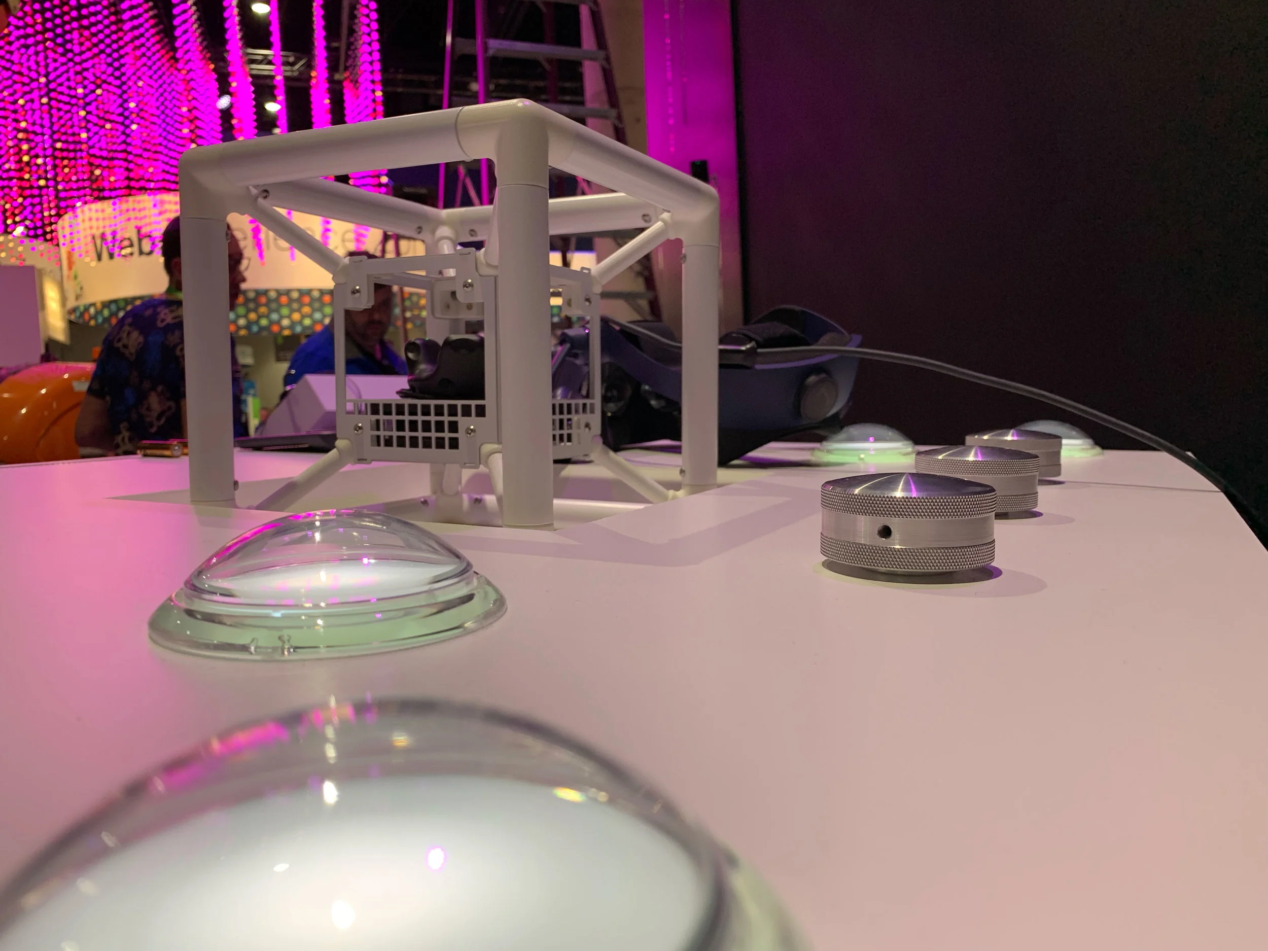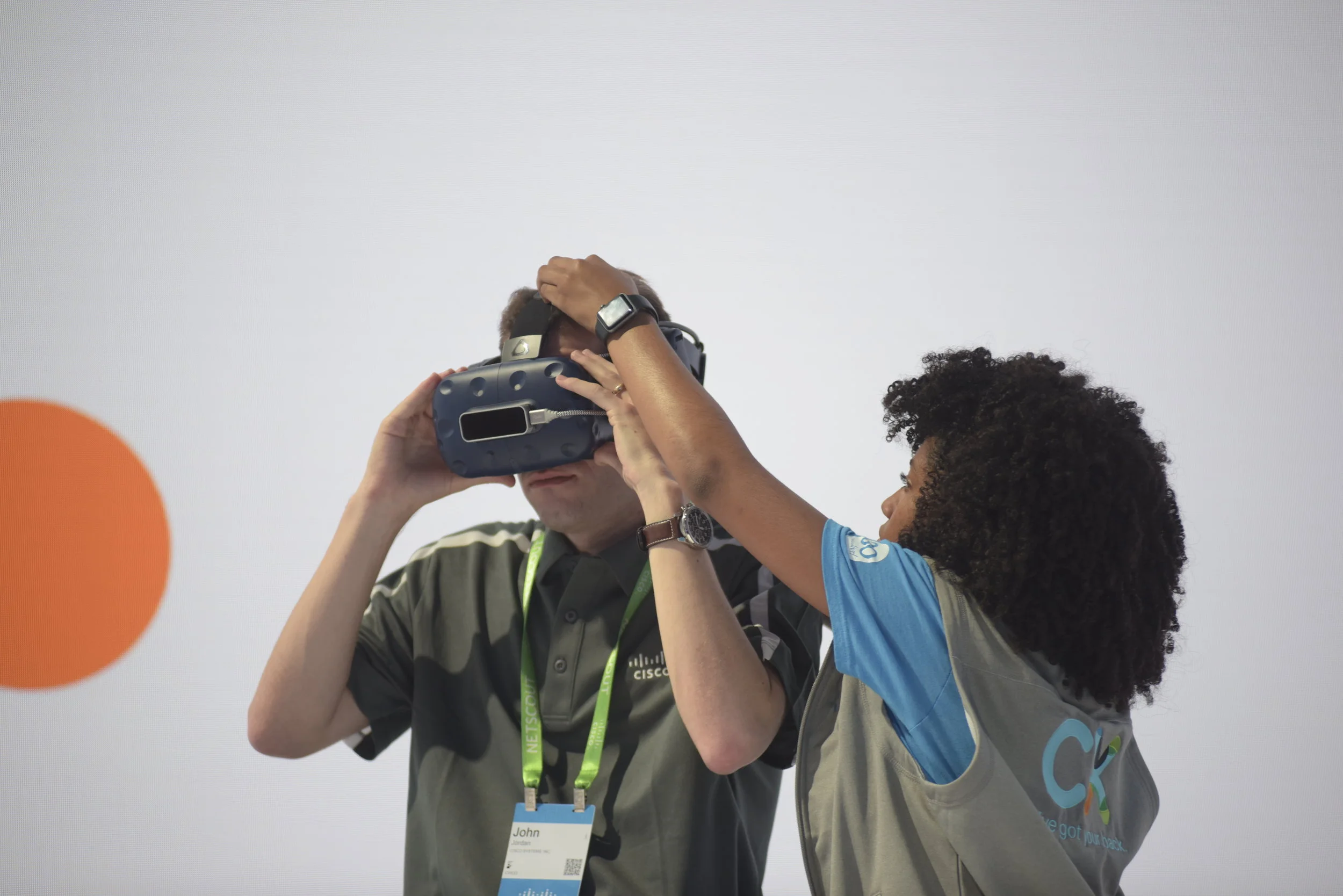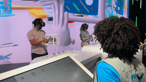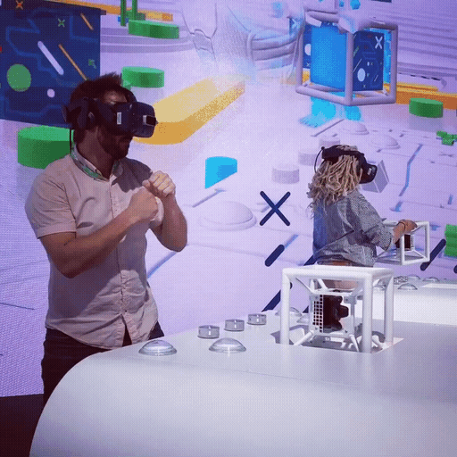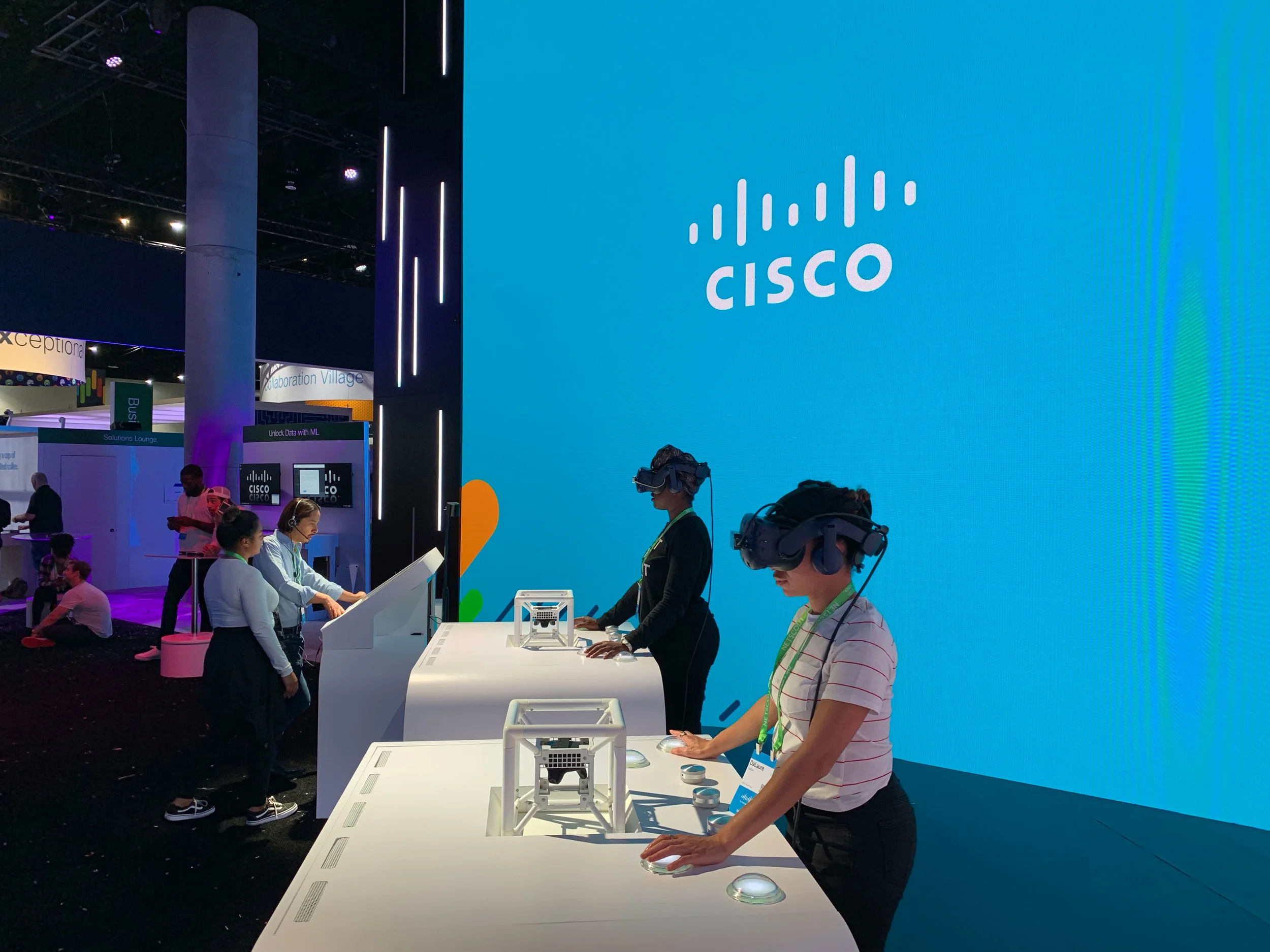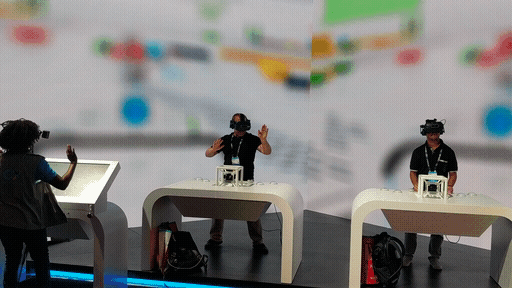 Two people were playing against each other and they had top of the line HTC Vive Pro headsets with an audio link directly to the Cisco experts, so they could be guided to victory. On the other end of the line, two Cisco experts - one for each user - had a custom console dashboard to see into the virtual space and guide them through the puzzles.